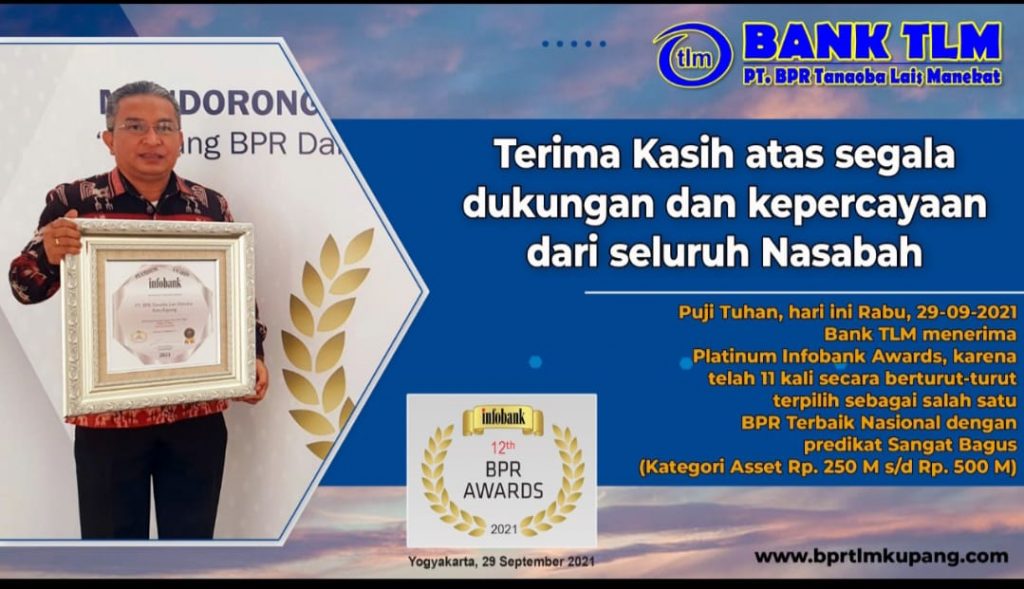 Atas capaian presatasi itu, pada tanggal 29 September 2021, Bank TLM menerima Platinum Infobank Awards. “Puji Tuhan, dan terimaksih atas dukungan para nasabah sehingga Bank TLM bisa mendapat penghargaan Platinum Infobank Awards,” sebut Dirut Bank TLM, Robert Fanggidae kepada SelatanIndonesia.com, Jumat (1/10/2021).