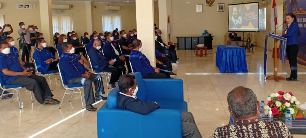 Pidato politik Ketua DPP Partai NasDem, Ny. Julie Sutrisno Laiskodat ketika melantik para Pengurus DPW Partai NasDem NTT periode 2021-2024 di Kupang, Jumat (7/5/2021). Foto: SelatanIndonesia.com/Laurens Leba Tukan