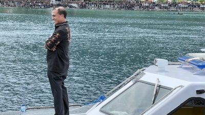 Wakil Ketua Komisi IX DPR RI Emanuel Melkiades Laka Lena dan keluarga serta Ketua DPD II Golkar Flotim Yosep Sani Betan dan rombongan ketika dalam pelayaran dari Larantuka menuju Wure, Adonara Barat dalam rangakaian perayaan Semana Santa Larantuka, Jumat (7/4/2023). Foto: Dok.Golkar Flotim
