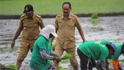Bupati Sumba Tengah, Paulus S. K. Limu ketika memimpin para ASN dan masyarakat melakukan penanaman padi program Food Estate diatas lahan seluas 240 Ha di Desa Manuwolu, Kecamatan Mamboro, Kabupaten Sumba Tengah, Senin (21/2/2022). Foto: PKP-SumTeng