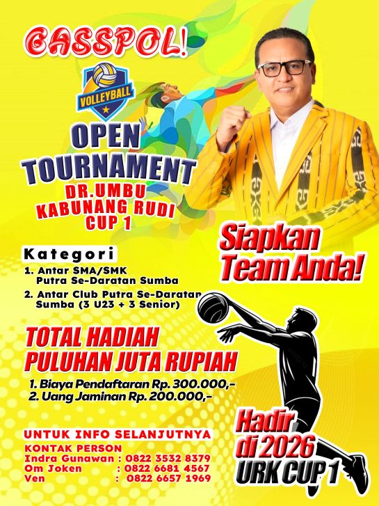 KUPANG,SELATANINDONESIA.COM — Semangat membangun prestasi voli di daratan Sumba menemukan momentumnya. Turnamen Dr. Umbu Rudi Kabunang (URK) Cup I dijadwalkan bergulir pada awal Maret 2026 di Waingapu, Kabupaten Sumba Timur, dengan total hadiah mencapai puluhan juta rupiah.