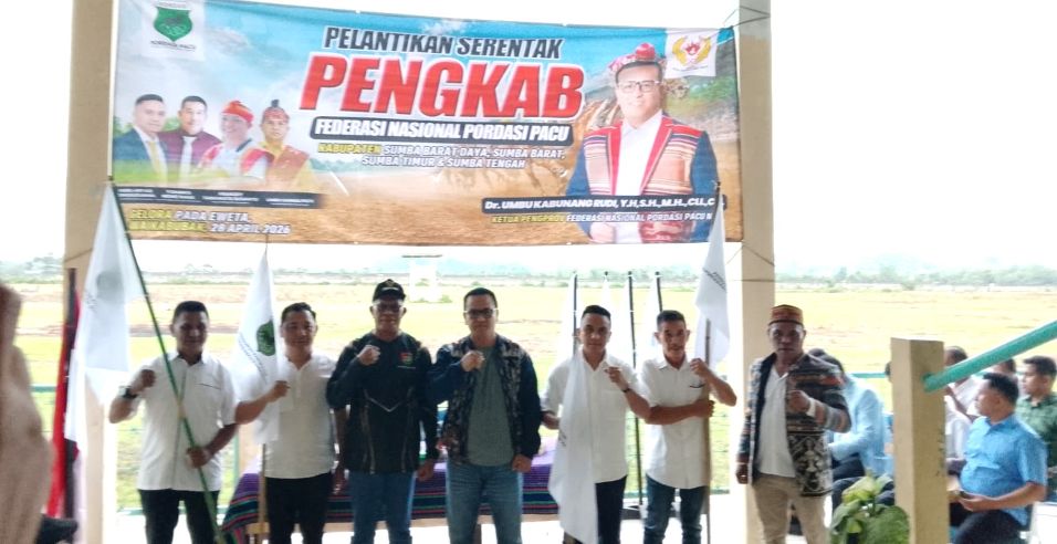 WAIKABUBAK,SELATANINDONESIA.COM – Suasana Gelora Pada Eweta, Waikabubak, Sumba Barat, Selasa (28/4/2026), menjadi titik awal kebangkitan pacuan kuda Sumba. Di arena yang selama ini dikenal sebagai pusat tradisi berkuda itu, Ketua Pengurus Provinsi Federasi Nasional Pordasi Pacu NTT, Dr. Umbu Rudi Kabunang, melantik empat ketua pengurus kabupaten dari Sumba Barat, Sumba Timur, Sumba Barat Daya, dan Sumba Tengah.