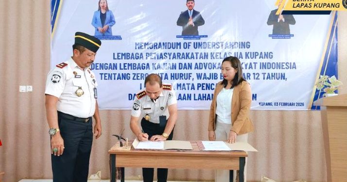 KUPANG,SELATANINDONESIA.COM โ Lembaga Pemasyarakatan (Lapas) Kelas IIA Kupang resmi menandatangani Memorandum of Understanding (MoU) dengan Lembaga Kajian dan Advokasi Rakyat Indonesia (LKA.RI) tentang program zero buta huruf, wajib belajar 12 tahun, pengembangan life skill mata pencaharian, serta pengelolaan lahan pertanian bagi warga binaan. Penandatanganan MoU ini menjadi langkah strategis dalam memperkuat pembinaan yang berorientasi pada kemandirian dan kesiapan reintegrasi sosial warga binaan, Selasa (3/2/2026).