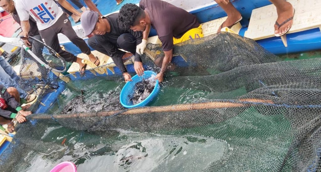 KUPANG,SELATANINDONEIA.COM – Dinas Kelautan dan Perikanan (DKP) Provinsi Nusa Tenggara Timur, Jumat (22/10/2021) melakukan panen ikan kerapu sebanyak 1,5 ton pada Keramba Jaring Apung (KJA) percontohan di desa Onansila, Kecamatan Semau, Kabupaten Kupang.