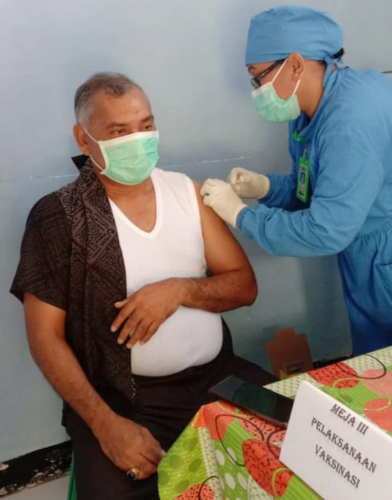 Ketua DPD II Golkar Kabupaten Alor yang juga Wakil Ketua DPRD Kabupaten Alor ketika disuntik vaksin oleh Nakes di Puskesmas Mebung, Kecamatan Alor Tengah Utara, Kabupaten Alor, Senin (8/3/2021)