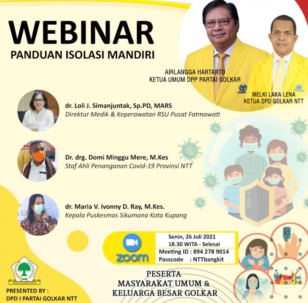 KUPANG,SELATANINDONESIA.COM – DPD Partai Golkar Provinsi Nusa Tenggara Timur (NTT) pada Senin (26/7/2021) malam menghadrikan tiga orang dokter dalam webinar dengan topik “Panduan Isolasi Mandiri”. Webinar ini diikuti masyarakat luas dan keluarga besar Golkar se-NTT.