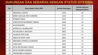 Fakta itu ditemukan setelah dilakukan finalisasi verifikasi administrasi dukungan awal pencalonan anggota DPD Provinsi NTT yang digelar di Hotel Kristal Kupang, Minggu (15/1/2023). Kedelapan calon anggota DPD RI itu diantaranya, Abraham Liyanto, Angelius Wake Kako, Christopher Raymond Tannur, Hilda manafe, Julianus Pote Leba, Patje Oktofianus Tasuib, Siti Saudah H. Mustafa, dan Thomas Seran.