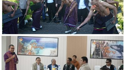 KUPANG,SELATANINDONESIA.COM – Hentakan kaki dan pekik perang menggema di lantai depan VIP Room Bandara El Tari, Kupang, Jumat pagi itu, (25/4/2025). Lima penari lelaki berbusana  nowing dengan wajah serius dan tubuh kekar melangkah mantap. Di tangan mereka, parang, tombak dan periasi kayu terayun dalam ritme yang mencekam. Ini bukan sambutan biasa.