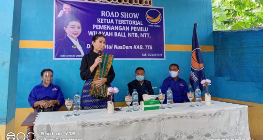 Anggota Fraksi NasDem DPR RI itu melakukan road show ke 22 Dewan Pimpinan Daerah (DPD) Partai NasDem se Provinsi Nusa Tenggara Timur. Dalam kunjungan ke DPD Partai NasDem TTS, Julie Laiskodat mengecek kesiapan DPD NasDem TTS yang berkaitan dengan kelengkapan pengurus NasDem, kondisi sekretariat, dan jumlah anggota Partai NasDem di Kabupaten TTS hingga saat ini yang ditargetkan hingga Agustus sudah mencapai 16.800 anggota.