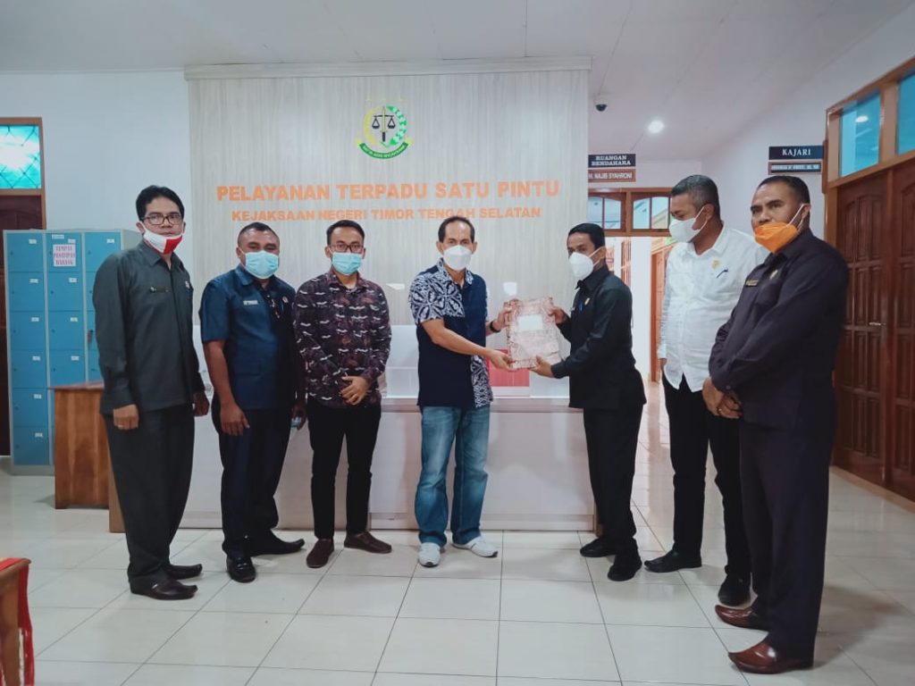 Ketua DPRD TTS Marcu Buana Mbau,SE (kanan) ketika menyerahkan Rekomandasi LKPJ kepada Kejari TTS Andarias D'Ornay SH MH di kantor Kejari TTS (Jumat 21/5/2021) Foto: SelatanIndonesia.com/Paul Papa Resi