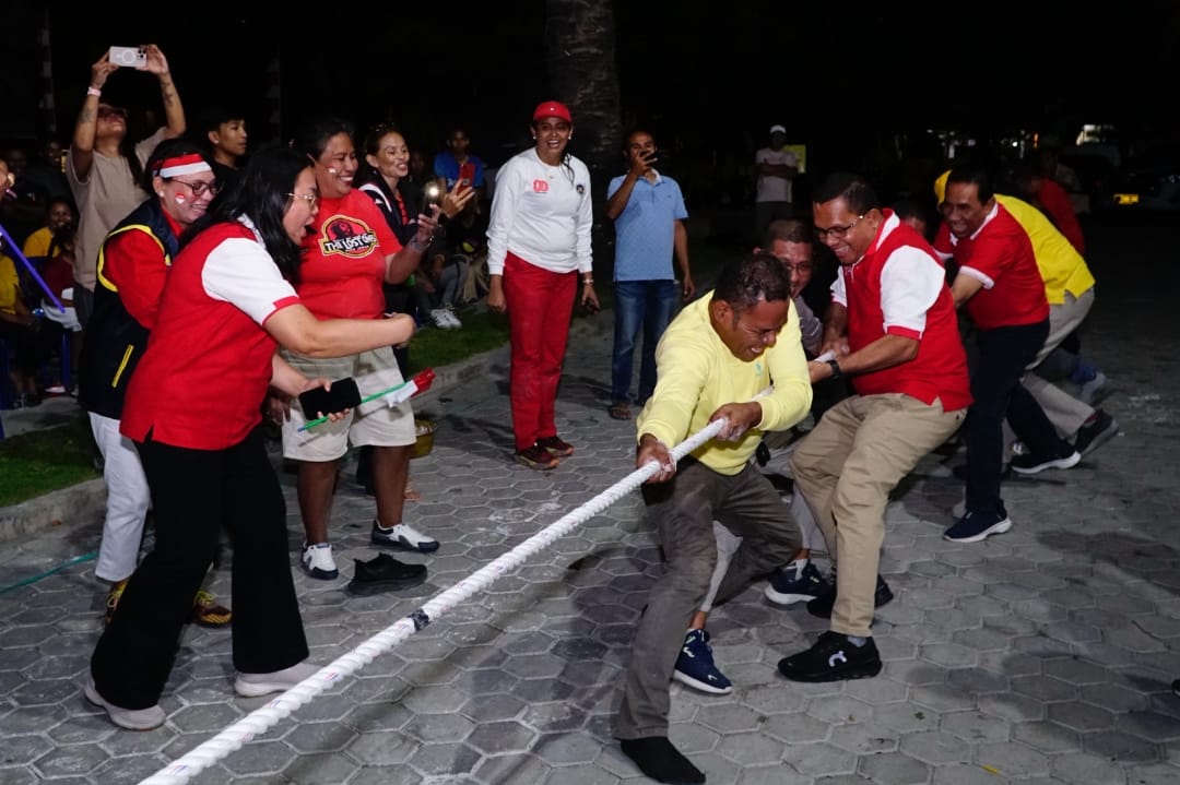 KUPANG,SELATANINDONESIA.COM – Sore itu, Sabtu (16/8/2025), halaman Kantor DPD I Partai Golkar NTT berubah menjadi arena rakyat. Tali tambang tebal terbentang di tengah, tanah berdebu, dan teriakan dukungan membahana. Di salah satu ujung, berdiri tegap Emanuel Melkiades Laka Lena, Gubernur NTT sekaligus Ketua DPD I Golkar NTT yang juga Wakil Ketua Umum DPP Partai Golkar. Jas kebesarannya ditanggalkan, diganti kaos merah yang santai. Ia ikut memegang tambang, beradu tenaga dengan kadernya sendiri.