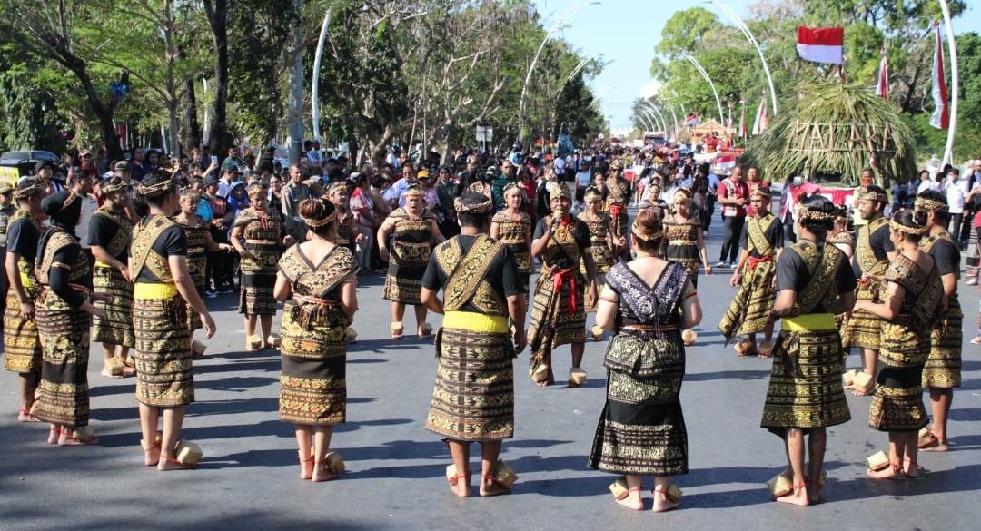 KUPANG,SELATANINDONESIA.COM – Terik matahari Kupang di siang hari itu, Rabu (13/8/2025), seperti tak menghalangi ribuan pasang kaki yang memadati Jalan El Tari Kota Kupang di depan Rumah Jabatan Gubernur NTT. Di antara riuh tawa dan denting gong yang berpacu dengan tiupan suling bambu, kain tenun warna-warni berkibar mengikuti arah angin. Aroma harum sirih pinang bercampur wangi bunga kenanga menguar dari barisan perempuan yang melangkah anggun.