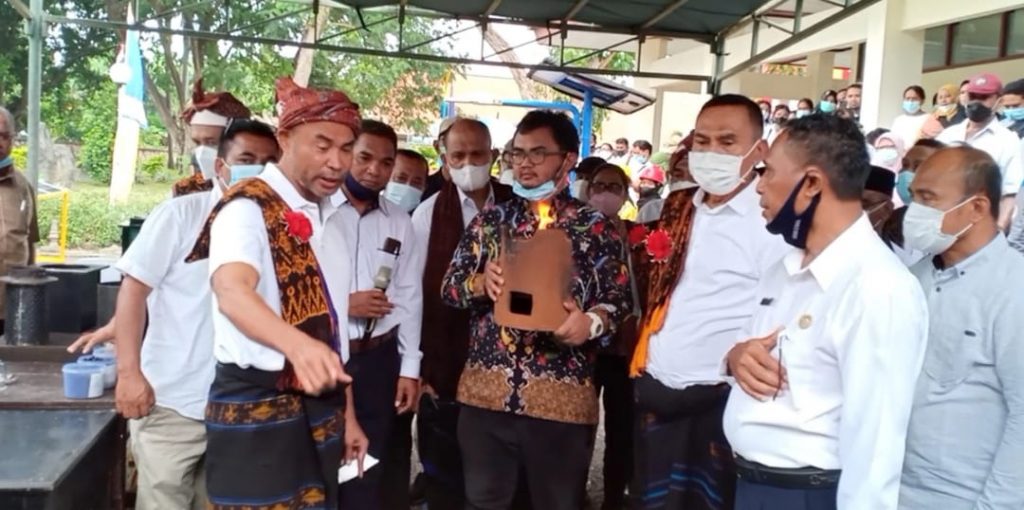 Gubernur Laiskodat memberikan apresiasi hasil Pelet biomasa yang dipakai oleh kompor yang dihasilkan oleh para siswa SMKN 2 Ende dan kelompok pengrajin Periuk tanah liat di desa Wolotolo serta program co-firing PLTU Ropa.