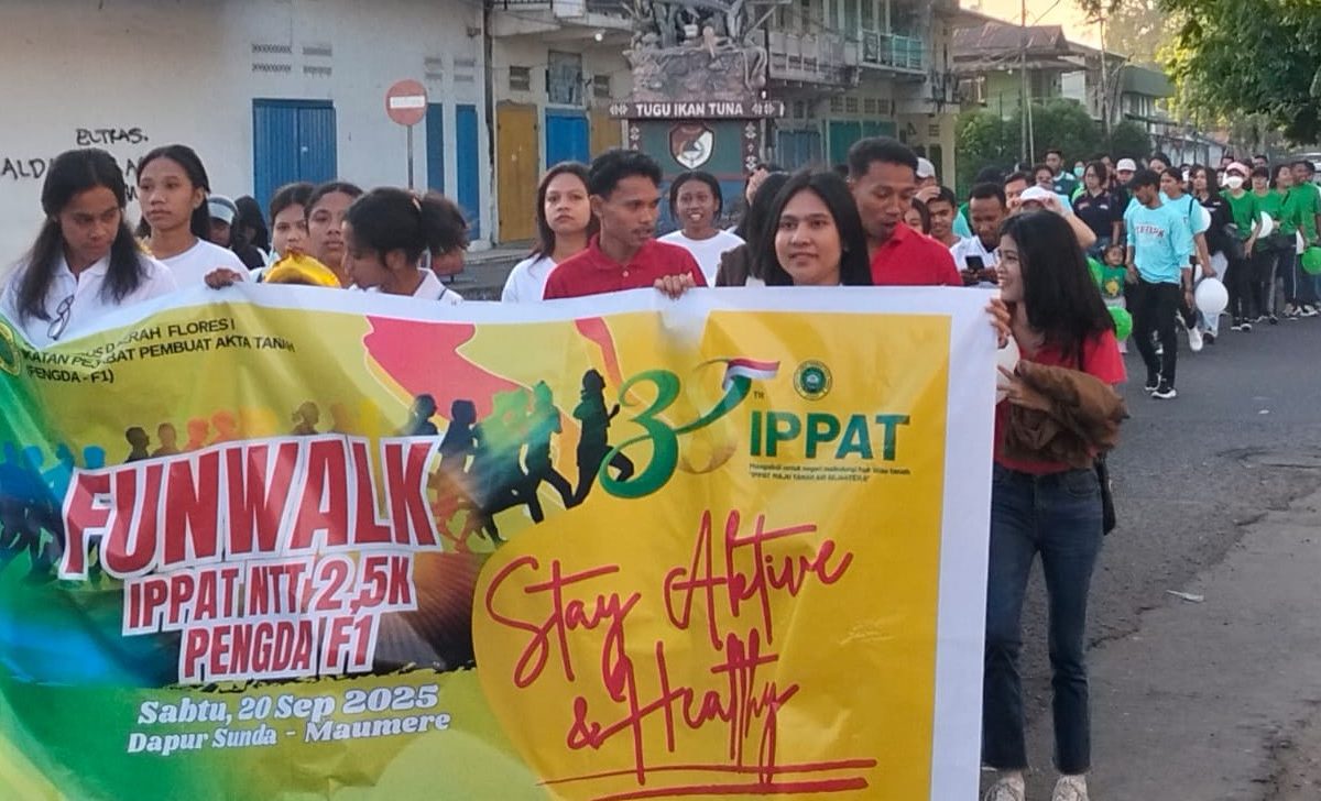 MAUMERE,SELATANINDONESIA.COM – Suasana Sabtu pagi (20/9/2025), di Maumere terasa berbeda. Ratusan peserta tampak bersemangat mengikuti jalan santai sejauh 2,5 kilometer yang menjadi pembuka rangkaian perayaan Hari Ulang Tahun ke-38 Ikatan Pejabat Pembuat Akta Tanah (IPPAT) Pengda Flores I.