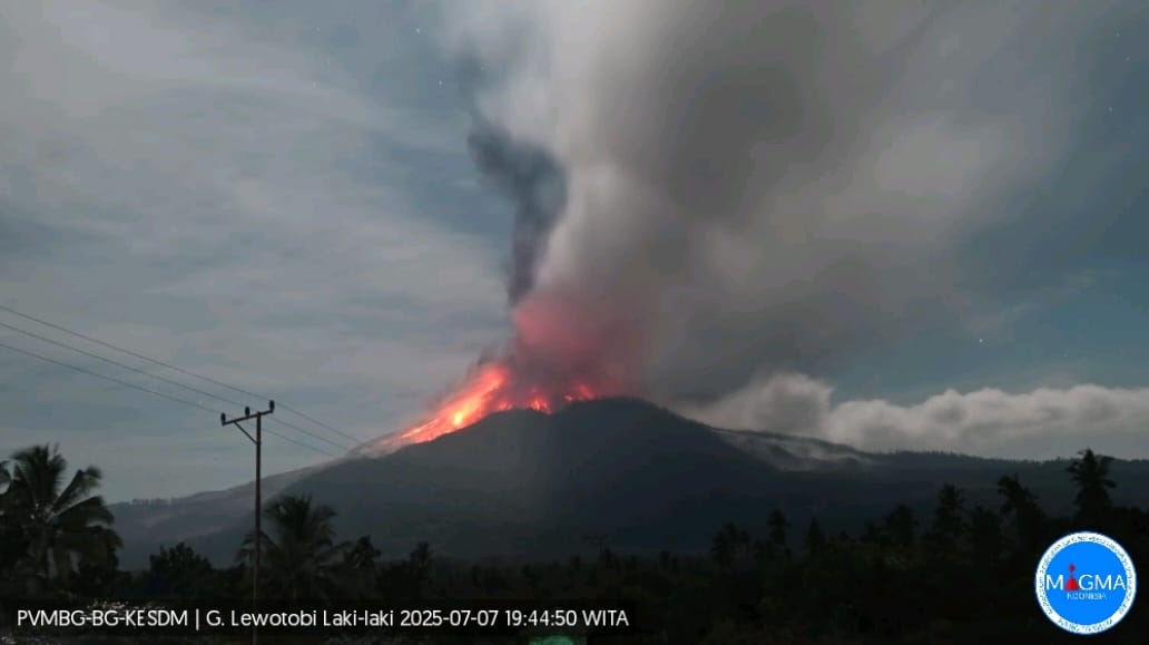 LARANATUKA,SELATANINDONESIA.COM — Langit di atas puncak Gunung Lewotobi Laki-laki menghitam pada Senin malam, (7/7/20205) pukul 19.32 WITA. Gunung yang terletak di Kabupaten Flores Timur, Nusa Tenggara Timur, itu kembali memuntahkan material vulkanik dengan kolom abu membumbung setinggi ±13.000 meter di atas puncak (±14.584 m dpl). Warna kelabu pekat hingga hitam menyelimuti langit malam, dengan arah sebaran condong ke barat dan barat laut.