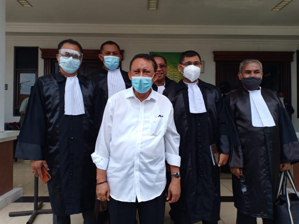 Jonas Salean bersama Tim Kuasa Hukum diantaranya, Yanto Ekon, Mel Ndaumanu, Yohanes Rihi, Benny Rafael, Benny Taopan, dan Rian Kapitan usai sidang putusan di PN Tipikor Kupang, Rabu (17/3/2021). Foto: SelatanIndonesia.com/Laurens Leba Tukan