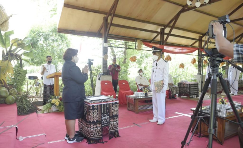 Bupati Roten Ndao, Ny. Paulina Haning Bullu, SE ketika melantik dan mengambil sumpah Kades Mbali Lendeiki, Kecamatan Ndao Nuse, Abraham Bunga di Alun-Alun Rumah Jabatan Bupati Rote Ndao, Rabu (3/3/2021).