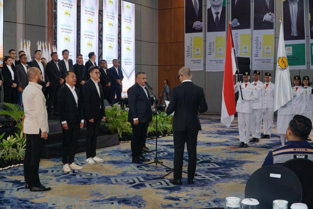 Ketua Umum BPP HIPMI, Akbar H. Buchari ketika melantik Restu Dupe sebagai Ketua Umum BPD HIPMI NTT periode 2025–2028, menggantikan M. Ikhsan Darwis. Ia didampingi Wilson Liyanto sebagai Sekretaris Umum dan Filmon Loasana sebagai Bendahara Umum. Pelantikan dilakukan di Hotel Harper Kupang, Rabu (29/10/2025). Foto: Nuel Here Wele