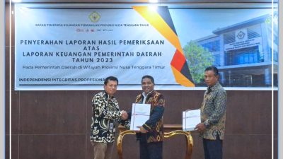 Diketahui, BPK Perwakilan NTT menyerahkan LHP BPK atas LKPD Pemerintah Kabupten Rote Ndao Tahun Anggaran 2023. Selain Kabupaten Rote Ndao, BPK Perwakilan NTT juga menyerahkan LHP kepada Kabupaten Sumba Tengah, Kabupaten Manggarai Timur dan Kabupaten Alor yang diterima masing-masing Pj. Bupati.*/)Bidkom_DKISP Rote Ndao/Prokopim)