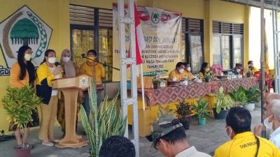 Ketua Ikatan Isteri Partai Golkar (IIPG) Provinsi NTT, Ny. Asty Laka Lena didampingi Ketua IIPG Sumba Timur Vivi Fadaq dan Anggota Fraksi Golkar DPRD Sumba Timur Rambu May serta Rambu Hamu ketika berbicara dalam forum Konsolidasi dan Sosialisasi Hasil Rakerda dan Rapimda serta Pertemuan Raya Milenial dan Perempuan NTT di Partai Golkar Kabupaten Sumba Timur, Jumat (18/2/2022). Foto: SelatanIndonesia.com/Laurens Leba Tukan
