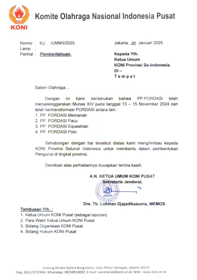 Langkah transformasi ini juga telah memperoleh legitimasi kuat dari Komite Olahraga Nasional Indonesia. Melalui Surat Keputusan Nomor 135 Tahun 2024, KONI mengukuhkan kepengurusan Federasi Nasional Pordasi Pacu masa bakti 2024โ2028. Penguatan organisasi berlanjut lewat SK Nomor 162 Tahun 2025 tentang pergantian antar waktu, serta surat pemberitahuan resmi tertanggal 20 Januari 2025 yang menegaskan bahwa PORDASI telah bertransformasi menjadi empat federasi terpisah.