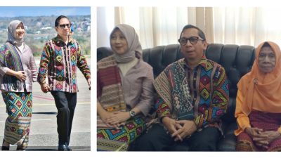 Mengenakan baju tenun NTT, didampingi istrinya yang juga Penjabat Ketua TP PKK NTT Sofiana Milawati Kalake langsung disambut dengan sapaan Natoni dan tarian Kataga serta tarian Hedung menuju ruang VIP. Rombongan Penjabat melewati pagar betis warga Lamaholot, yang berbusana putih plus nowing dan kewatek.