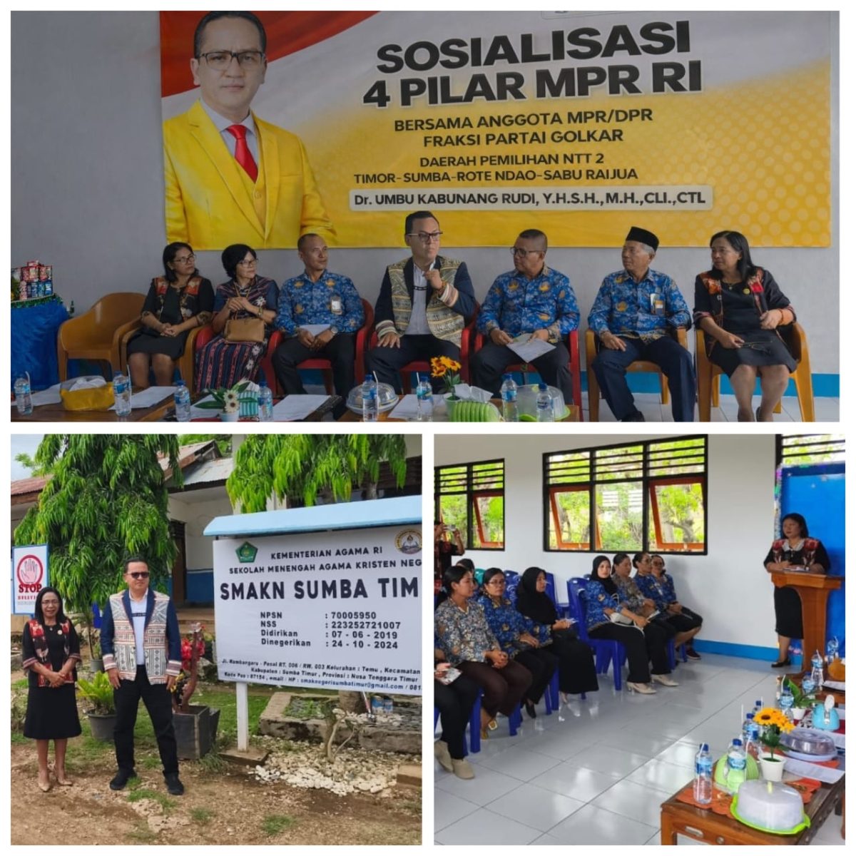 WAINGAPU,SELATANINDONESIA.COM — Di tengah tantangan zaman yang kian menggerus nilai-nilai kebangsaan, sekolah menjadi ruang strategis untuk menanamkan kembali semangat persatuan. Itulah yang tampak dalam kegiatan sosialisasi Empat Pilar Kebangsaan oleh Anggota MPR RI, Umbu Rudi Kabunang, di Sekolah Menengah Agama Kristen Negeri (SMAKN) Sumba Timur, Selasa (9/12/2025).